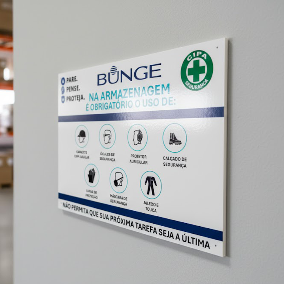Placas de alerta, proibição, obrigatoriedade e emergência, com pictogramas claros e leitura imediata. Materiais e acabamentos adequados para ambientes internos e externos, com fixação sob medida e longa durabilidade.